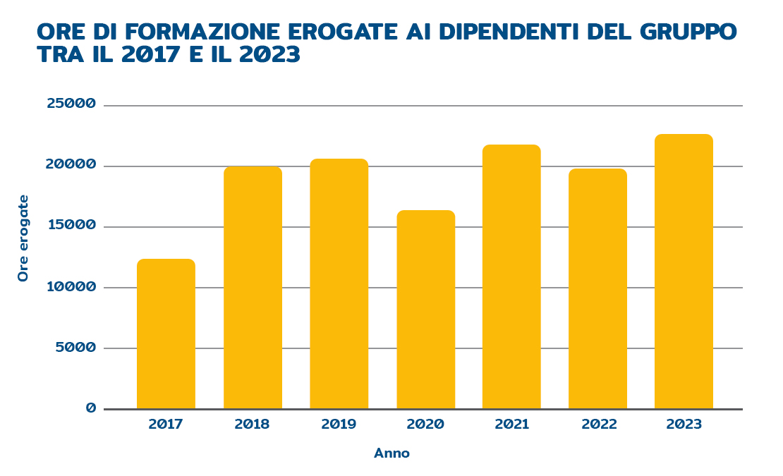 Il grafico che segue mostra come nel tempo le risorse dedicate alla formazione siano progressivamente cresciute, raggiungendo ottimi risultati in termini di ore erogate e competenze raggiunte dal personale.
