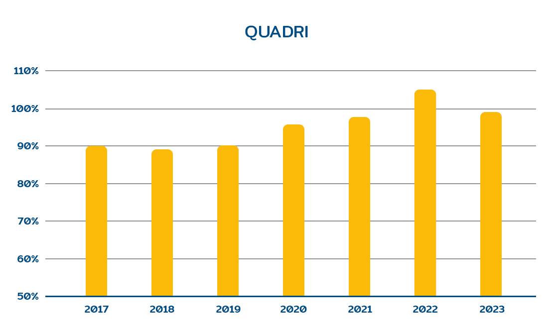 Come illustrato dal grafico che segue, il divario salariale tra donne e uomini negli anni è stato gradualmente ridotto, fino a raggiungere un risultato che vede la retribuzione femminile allineata a quella maschile per impiegati e quadri.