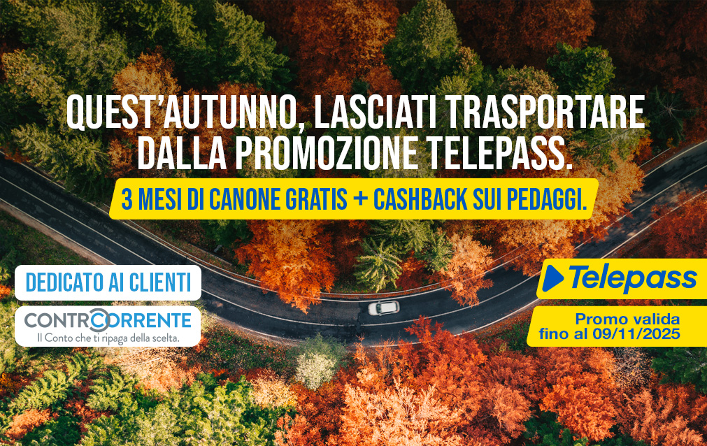 Richiedi Telepass in filiale e approfitta subito della promozione autunnale, hai tempo fino al 9 novembre 2025.