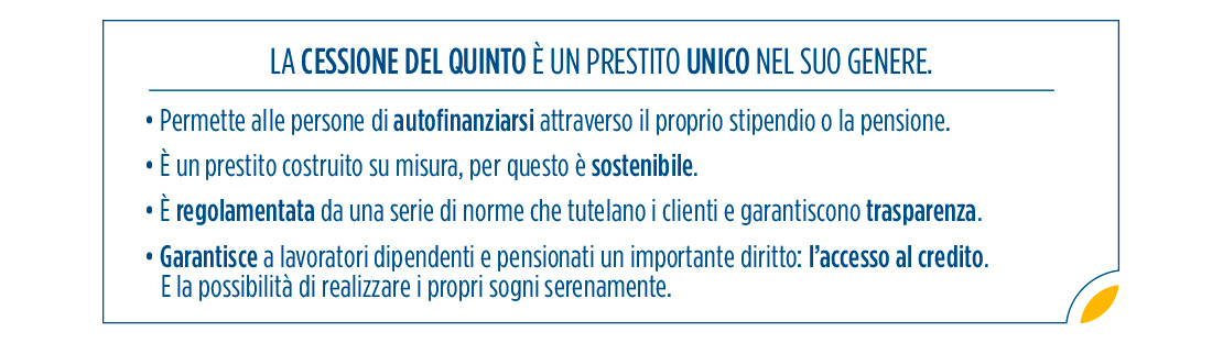 Un prestito sostenibile e inclusivo: con la cessione del quinto dello stipendio/pensione agevoliamo l’accesso al credito da parte di famiglie e persone - anche coloro che non potrebbero in altro modo ottenere un prestito - attraverso un finanziamento sostenibile, che prevede condizioni personalizzate e una rata quantificata in base al proprio reddito. La cessione del quinto consente infatti di autofinanziarsi attraverso il proprio stipendio o la pensione, favorendo l’inclusione finanziaria anche a un pubblico in età avanzata.