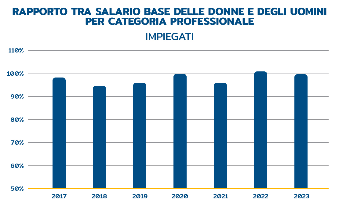 Come illustrato dal grafico che segue, il divario salariale tra donne e uomini negli anni è stato gradualmente ridotto, fino a raggiungere un risultato che vede la retribuzione femminile allineata a quella maschile per impiegati e quadri.
